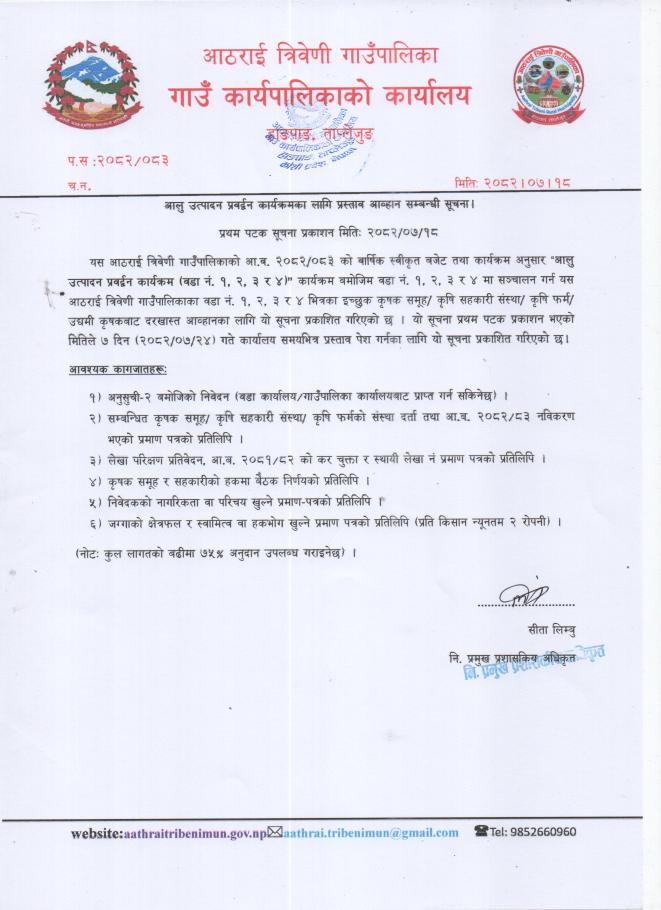 आलु उत्पादन प्रवर्द्धन कार्यक्रमका लागि प्रस्ताव आह्वान सम्बन्धी सूचना ।