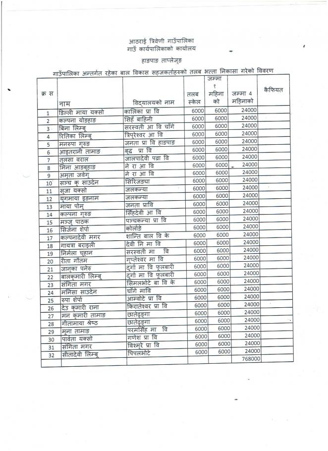 आठराई त्रिवेणी गाउँपालिका अन्तर्गतका सम्पूर्ण विद्यालयहरुको तलब भत्ता निकासा सारांश निम्न रहेको जानकारी गरिन्छ...........